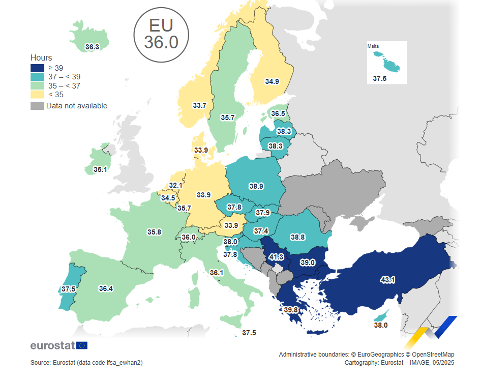 Трето, това, че българите работят по-малко от „европейците“ решително не отговаря на статистическите данни. България всъщност е страната в Европейския съюз с втората най-дълга продължителност на работната седмица – средно 39 часа, при 36 часа средно за ЕС. Германия, която ДСБ дават като пример, е само с 33.9 работни часа на един зает седмично. Казано другояче, средният български работник работи с около 15% по-дълго от средния немски работник. Данните, които цитирам, са на Евростат.