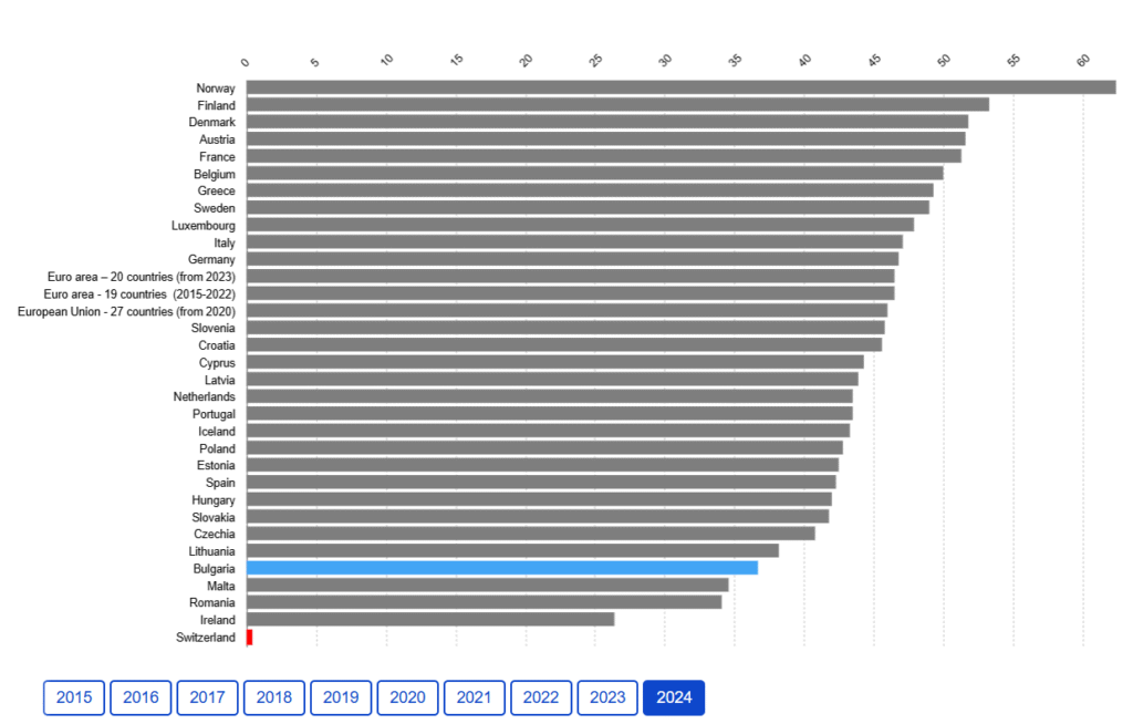 По данни на Евростат, през 2024 г. с правителствени приходи на ниво 36.7% от БВП, България е на дъното на този показател в Съюза. По-нисък дял на данъчните приходи от България има само Малта (два малки острова), Ирландия (със силно надут БВП, защото там са седалищата на глобални корпорации) и Румъния (с неадекватна данъчна система, която през 2025 г. вече наложи вдигане на данъците). България рязко изостава от останалите в ЕС по отношение на данъците, които събира от бизнеса и населението. Средно за ЕС данъците формират 46% от БВП.