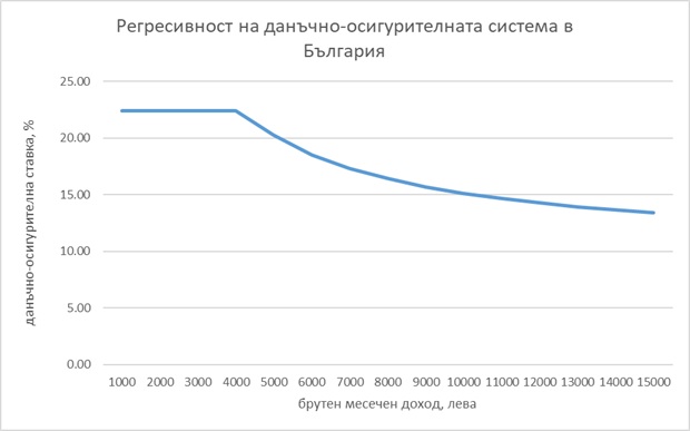 Да не говорим, че човек с по-ниски доходи в една типична европейска страна ще бъде подпомогнат с необлагаем минимум: ако заплатата му е под даден праг, той/тя няма да плаща данъци и осигуровки. В България не само че няма необлагаем минимум, ами ако си беден, плащаш по-висок процент от заплатата си като данъци и осигуровки в сравнение с богатия. Графиката ясно показва регресивността на данъчната система в България.